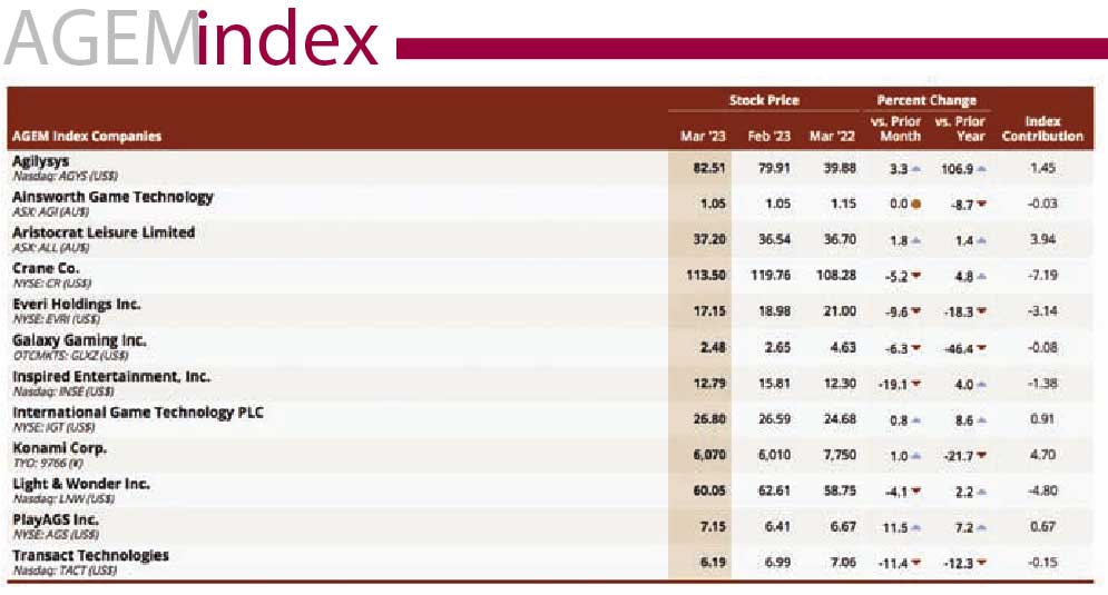 The AGEM Index decreased by 5.1 points in March 2023 to 945.81, a 0.5 percent decrease from the prior month. Compared to one year ago, the index was down 9.59 points, or 1 percent. During the latest month, six of the 12 AGEM Index companies reported stock price increases, which resulted in five positive contributions to the AGEM Index and seven negative contributions. The largest positive contribution to the monthly index was sourced to Konami Corp. (TYO: 9766), whose 1 percent increase in stock price led to a 4.7-point gain to the index. Additionally, Aristocrat Leisure Limited (ASX: ALL) saw its stock price increase by 1.8 percent, leading to a 3.94-point gain for the index. The largest negative contribution to the index was sourced to Crane Co. (NYSE: CR), whose 5.2 percent decrease in stock price resulted in a 7.19-point loss for the AGEM Index. All three major U.S. stock indices saw month-over-month increases in March. The NASDAQ increased by 6.7 percent from February, while the S&P 500 grew by 3.5 percent. Meanwhile, the Dow Jones Industrial Average increased by 1.9 percent from the prior period.