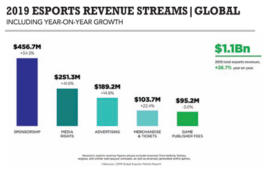 However, esports provide multiple options for investors seeking brand exposure, as well as other opportunities for the gaming industry specifically, namely wagering. Industry stakeholders benefit from a diverse array of revenue streams, including media rights, sponsorships, branding, content licensing, game publisher fees, ticket sales, merchandising, entry fees, arcade time, viewership, advertising, in-game purchasing and digital economies.