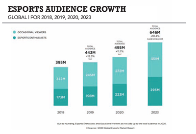 Today, more than 1.5 billion people are aware of esports, while approximately 500 million people make up its audience. By 2023, this figure is expected to grow to more than 650 million. In terms of viewership, major esports events are gaining ground against professional sporting events produced by the NBA, NHL, Formula 1, NASCAR and NFL. Starting in March, esports gained the attention of these leagues (which were largely shut down for months) and numerous others as it consistently gained new followers and partnerships despite the pandemic.