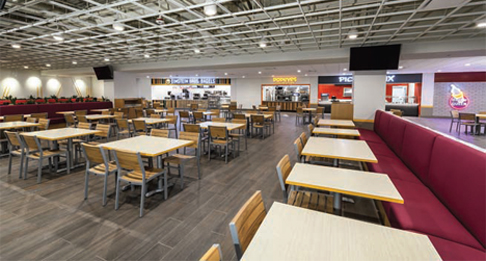 Architectural firm Bergman Walls & Associates achieved an open floor plan by removing a section of a hotel tower shear wall. The upgrade turned parts of the existing buffet, baggage claim and retail spaces into a 16,000-square-foot food court offering multiple fast-casual options.