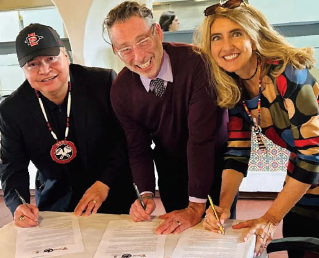 Signed on campus at SDSU later the same day, the MOU is intended to accomplish a number of concrete objectives. In the short term, faculty in AIS and the SITG will support the RLNC to facilitate student participation in the online AIS degree completion program at SDSU to include the Certificate in Tribal Casino Operations Management offered by the SITG.