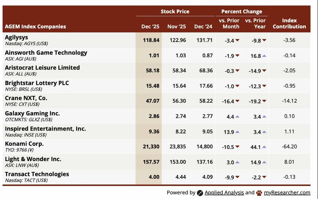 The AGEM Index fell by 75.93 points to 1,831.68 in December 2025, a 4 percent decrease from the prior month. Compared to one year ago, the index rose 17.1 percent, or 266.86 points. During the latest month, seven of the 10 AGEM Index companies reported stock price decreases, which pulled the overall index value down despite positive contributions by three companies. The largest negative contributor to the monthly index was Konami Corp. (TYO: 9766), whose 10.5 percent decrease in stock price led to a 64.20-point loss to the index. Meanwhile, Crane NXT, Co. (NYSE: CXT) saw its stock price decrease by 16.4 percent, leading to a 14.12-point decrease for the index. The largest positive contributor to the index was Light & Wonder Inc. (NASDAQ: LNW), whose 3 percent increase in stock price resulted in an 8.01-point gain to the AGEM Index. In December, two of the three major U.S. stock indices decreased from the prior month. The NASDAQ fell by 0.5 percent over the month, while the S&P 500 experienced a 0.1 percent decrease. Meanwhile, the Dow Jones Industrial Average rose by 0.7 percent from the prior period.