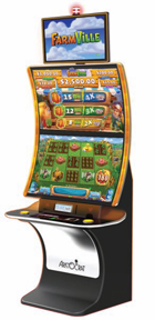 The MarsX cabinet family, of course, is not the only form Aristocrat videos take. The unique flame55 curved-monitor cabinet this year hosts another sequel to a hit game—FarmVille 2.