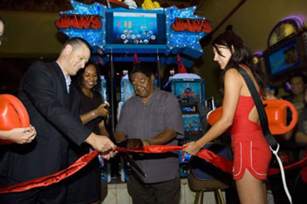 Aristocrat’s newest video slot product, Jaws, made its premiere at Sycuan Casino last month. Sycuan Band of the Kumeyaay Nation Tribal Chairman Daniel J. Tucker led the ribbon-cutting, with five of Sycuan’s best players jumping in to be the first to play.