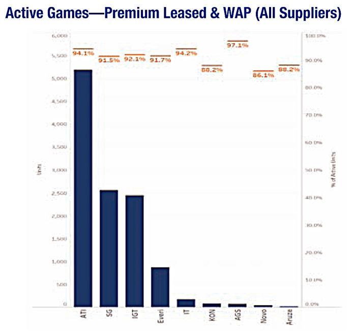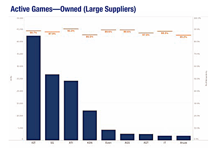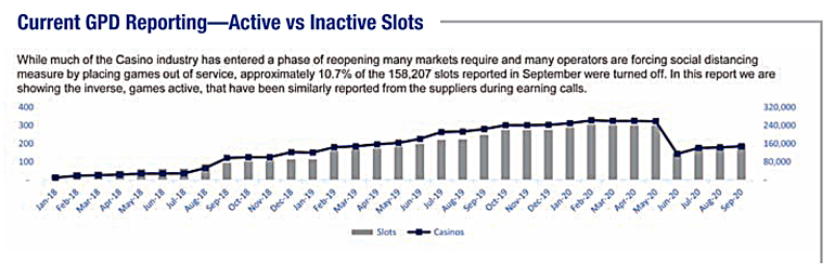 Gaming Reports issued a special report, “Eilers-Fantini Data Insights—Active Games Report—October ’20.” The report showed that of 158,207 slots surveyed by Eilers-Fantini, 10.7 percent of the games were turned off. The report considered the inverse, games active, that have been similarly reported from the suppliers during earnings calls. The bottom chart is the number of games active and the two other charts are the major segments of the slot business. The orange lines at the top of each column indicate the percentage of games active in October 2020.