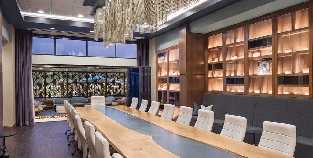 “That insight became a guiding principle for the entire project,” says Baruffaldi. The vision continues in a new Tribal Council Boardroom, which is also strongly representative of Karuk culture. A custom-built table subtly references the movement of water, and a mix of light and dark woods reflects the surrounding forests and terrain. Full display walls showcase tribal artifacts. The result is a sense of place that is also educational.