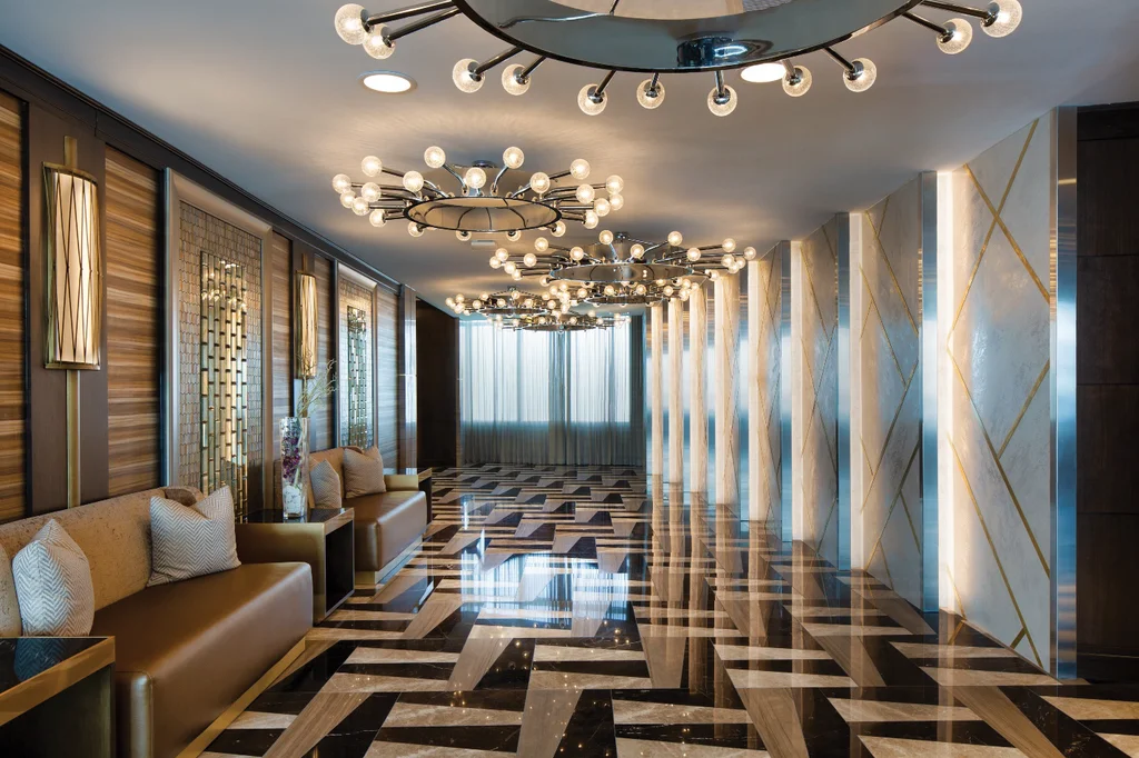 Along with updating hundreds of guest rooms, suites, corridors and lobbies, the project also included makeovers of the two Presidential Suites, with themes of fire and water. They feature open layouts, custom finishes, floor-to-ceiling fireplaces and in-suite bars, complemented by natural stone, metallic accents and special appointments like private shuffleboard tables.