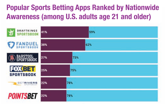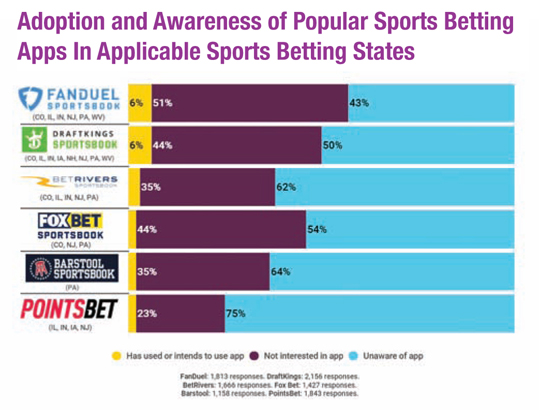 The new sports betting industry in the United States already has several recognizable brands. But how recognizable? The sports betting community is still relatively small and very young. While some 25 states and territories have legalized sports betting, many of them are not yet operating, and others are still mostly in their nascent stages. Nonetheless, CivicScience recently released a survey of almost 7,000 people to determine what brands are currently resonating with bettors—and non-bettors. Five brands showed up on the first page. Understandably, fantasy sports, now also sports betting, took the top two spots. The first chart at left measures simply whether respondents knew about the brands and the second outlines whether they know the brands and whether or not they are or will be participating.