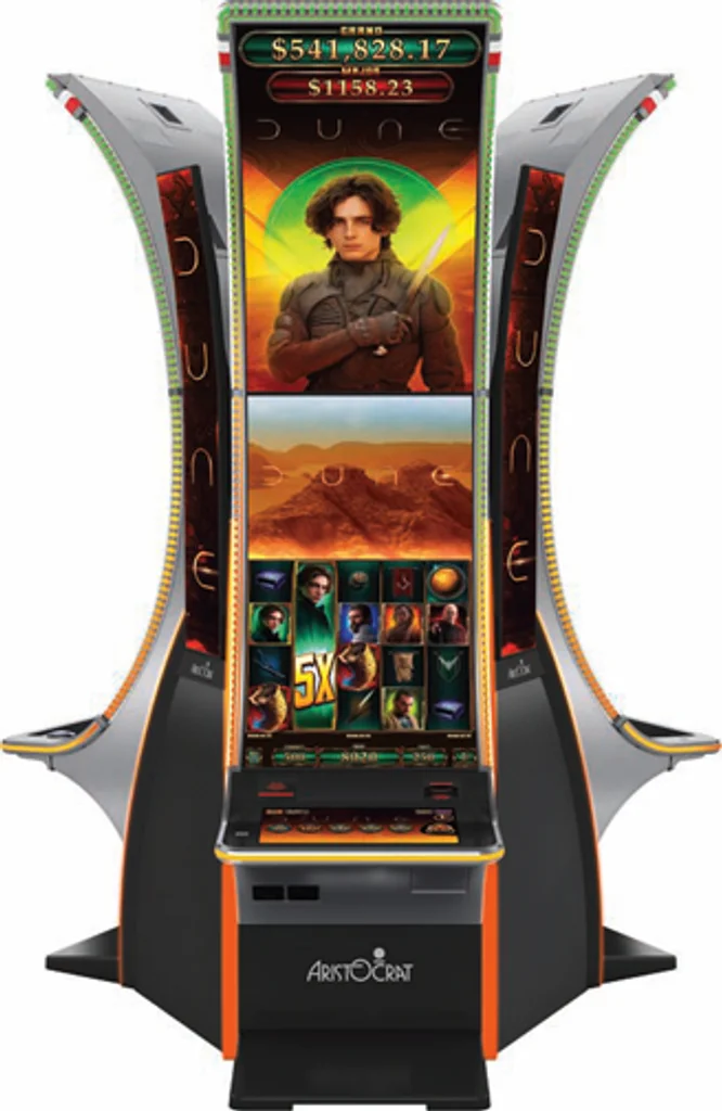 Dune is featured on Aristocrat’s new Neptune Double cabinet, its stacked, curved 49-inch 4K monitors perfect to provide an immersive, theatrical visual experience, along with state-of-the-art sound, and a custom-designed, adjustable sound chair.