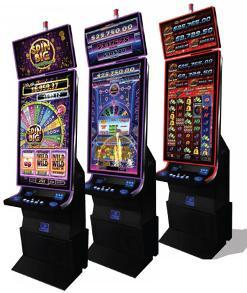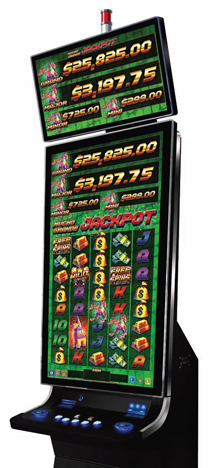 The common feature is a two-tiered bonus wheel, spun for credit awards, free games, or one of two progressive jackpots, played out on a huge wheel that covers most of the 49-inch portrait monitor. Hitting an “upgrade” symbol on the first wheel activates the second wheel, with higher-paying wedges.