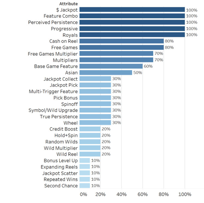 2023 ended with 64 percent of the top 25 New Core Video with Feature Combo attributes, an increase from 36 percent from the same time last year. As the year concluded, a staggering 100 percent of the top 10 games had this feature. Yes – you read that right: 100 percent!