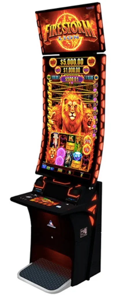 This new slot series on Aruze’s oversized Muso-55 cabinet features unique free-game and hold-and-spin sequences. There are two inaugural base games, Firestorm Lion and Firestorm Bull.