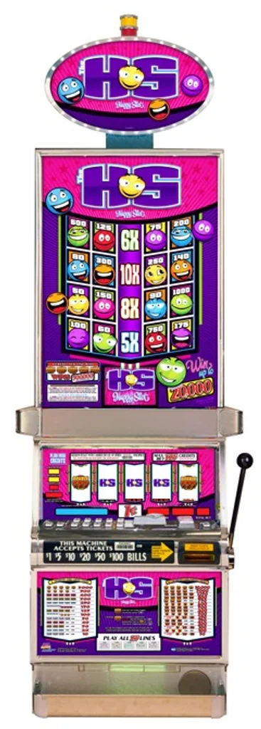 Both the main bonus and the Quick Hit bonus use the top-box bonus board. The Big Hit bonus occurs every seven spins, on average. It is initiated by two scattered “HS” symbols (for Happy Slot) on the middle reels. Award squares on the top-box bonus light up and randomly go out one by one until one is left for the player’s award, averaging 149 credits.