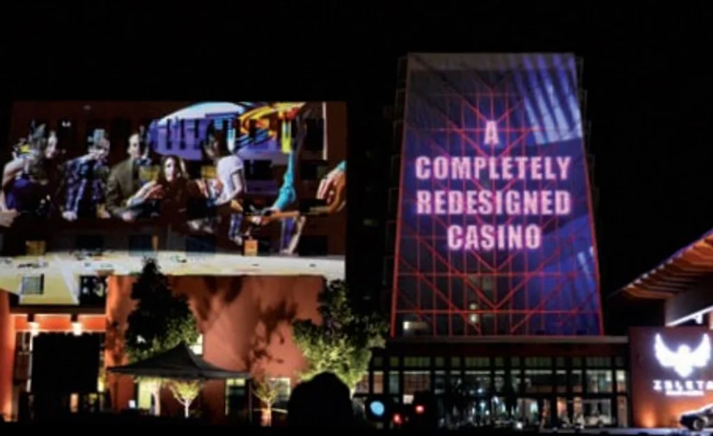 The Isleta Resort & Casino in Albuquerque, operated by Enterprise of Pueblo of Isleta, held a grand reopening on July 12. Previously the Hard Rock Hotel & Casino Albuquerque, the property has returned to its Native American roots. The celebration opened with a visual spectacle featuring breakthrough technology that projected upon the eight-story tower an image of the building seeming to fill up with water and explode to unveil the Isleta logo, which then transfigured into a soaring eagle. Then 100-foot, three-dimensional images of the new property projected on the building. The complete 15-minute show could be seen from dusk to 2 a.m., and was broadcast for five days.