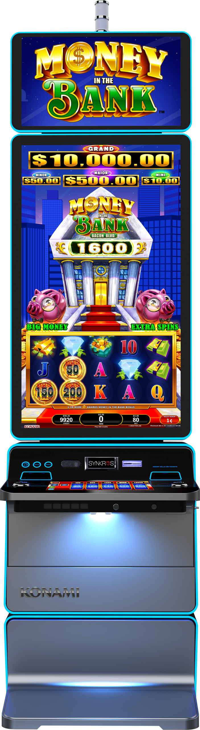 These games set the stage for several new game launches for Konami at the Global Gaming Expo. Up front is Money in the Bank, with base games Bacon Blvd. and Pay Out West. The core mechanic of this game revolves around a banked credit system, which scales with the player’s chosen denomination and bet level. It’s designed to encourage players to increase their bets as they play, enhancing both excitement and potential rewards.