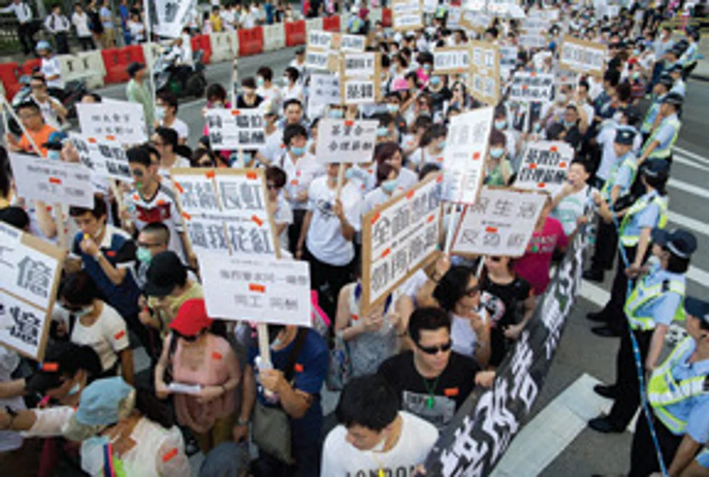 On Labor Day, an estimated 1,800 marchers led by some 13 labor and civic groups braved scattered rain, oppressive humidity and afternoon temperatures approaching 90 degrees to demonstrate for job security and housing and welfare reforms. Most were gaming, transportation and lower-level public-sector workers, but there were political activists in the crowd, and old people and students protesting the force-feeding of a pro-Communist Party school curriculum devised by the Chinese government and known as “national education.”
