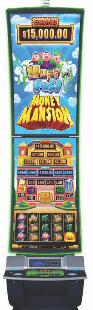 Another extension of the brand is Huff N’ Puff Money Mansion, on the giant Mural cabinet. In this game, released in late summer, the massive Mural screen hosts a cash-on-reels bonus feature on an expanded reel array. The three little pigs randomly appear in the base game to help trigger the bonus.