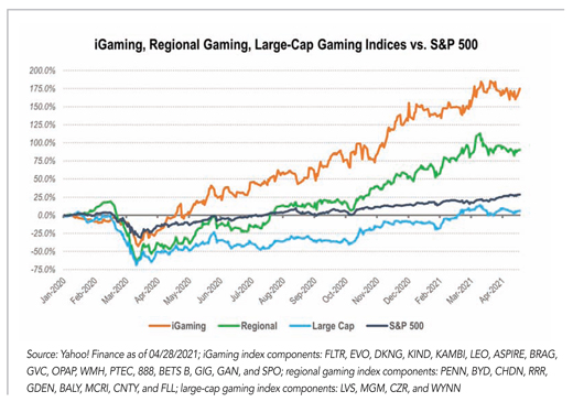 Arguably of foremost interest is how online gaming can affect traditional bricks-and-mortar casino operations. Since the onset of the pandemic in early 2020, iGaming operators collectively have achieved substantial growth and dramatically outpaced their traditional counterparts and the S&P 500 index, as shown in the chart above.