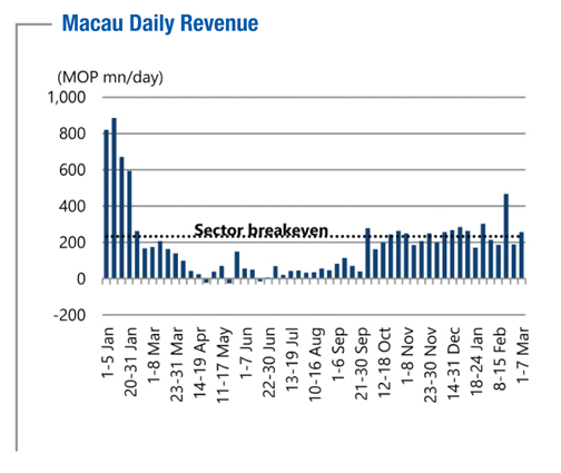 “We believe a sharper Macau GGR recovery will depend on border restrictions easing via: 1) China re-instituting the electronic IVs; 2) removal/ extension of the requirement for a negative nucleic acid certificate within seven days of arrival; and, 3) removal/relaxation of compulsory quarantine for Hong Kong and Taiwan arrivals. China has reported no new local infection cases since February 14, and only one local infection case since February 7. Meanwhile, Hong Kong has reported less than 20 new daily cases this month.”