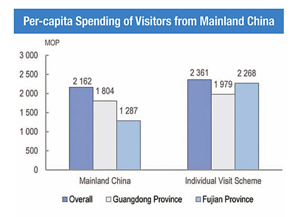 The emphasis on mass market in Macau means that the government has been encouraging operators to develop non-gaming attractions that will increase non-gaming spend. In the most recent report by the Government of Macao Special Administrative Region Statistics and Census Service, non-gaming spend was broken down by visitors from China and other parts of Asia. The biggest takeaway is that overnight visitors spend far more than day-trippers, consistent with the government’s desire to add more hotel rooms to the destination. And just like the massive lead in non-gaming volume, per-capita spend by visitors from mainland China also leads all other regions of the world.