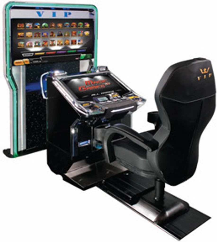 Then there’s the NovoStar V.I.P. slant-top. Few U.S. operators have seen it, though it’s turning plenty of heads in other parts of the world. This is a high-end theater experience that invites the player to get comfortable in a plush, high-backed captain’s chair for gaming and a 27-inch TFT touch-screen enhanced with a second, giant 50-inch HD screen ideally positioned behind the cabinet to deliver a panoramic view of the action.