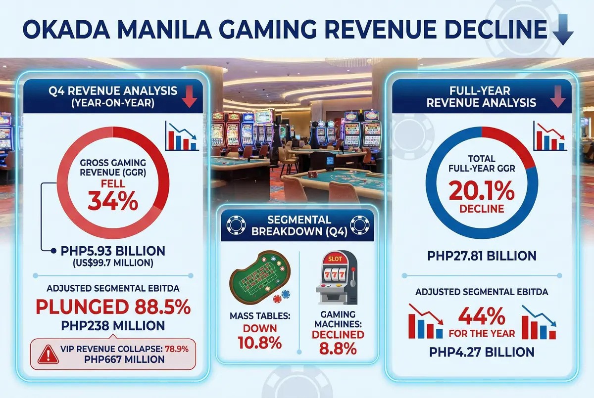 - Okada Manila experiences a 34% quarterly decline in gaming revenue, driven by VIP market struggles.