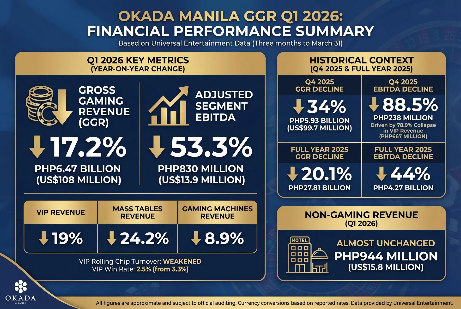 According to the company’s preliminary filing, the property’s problem was not footfall but spend. VIP rolling chip turnover weakened, and the VIP win rate fell to 2.5% from 3.3% a year earlier. Non-gaming revenue was almost unchanged at PHP944 million (US$15.8 million), helped by hotel and ancillary income.