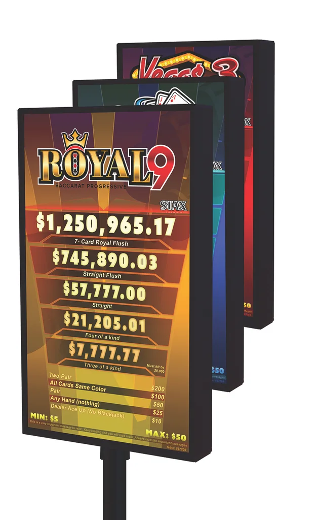 AGS has two main progressive side-bet products. The first, STAX, is fully card-based. A designated card combination triggers the winning progressive meter. “You could be playing a hold’em-style game and it may be a royal flush with your two cards,” says Hemberger, “or a three-card flop in a particular suit that awards the top award, but it’s going to be some card combination during that round of play that’s going to trigger a jackpot.”