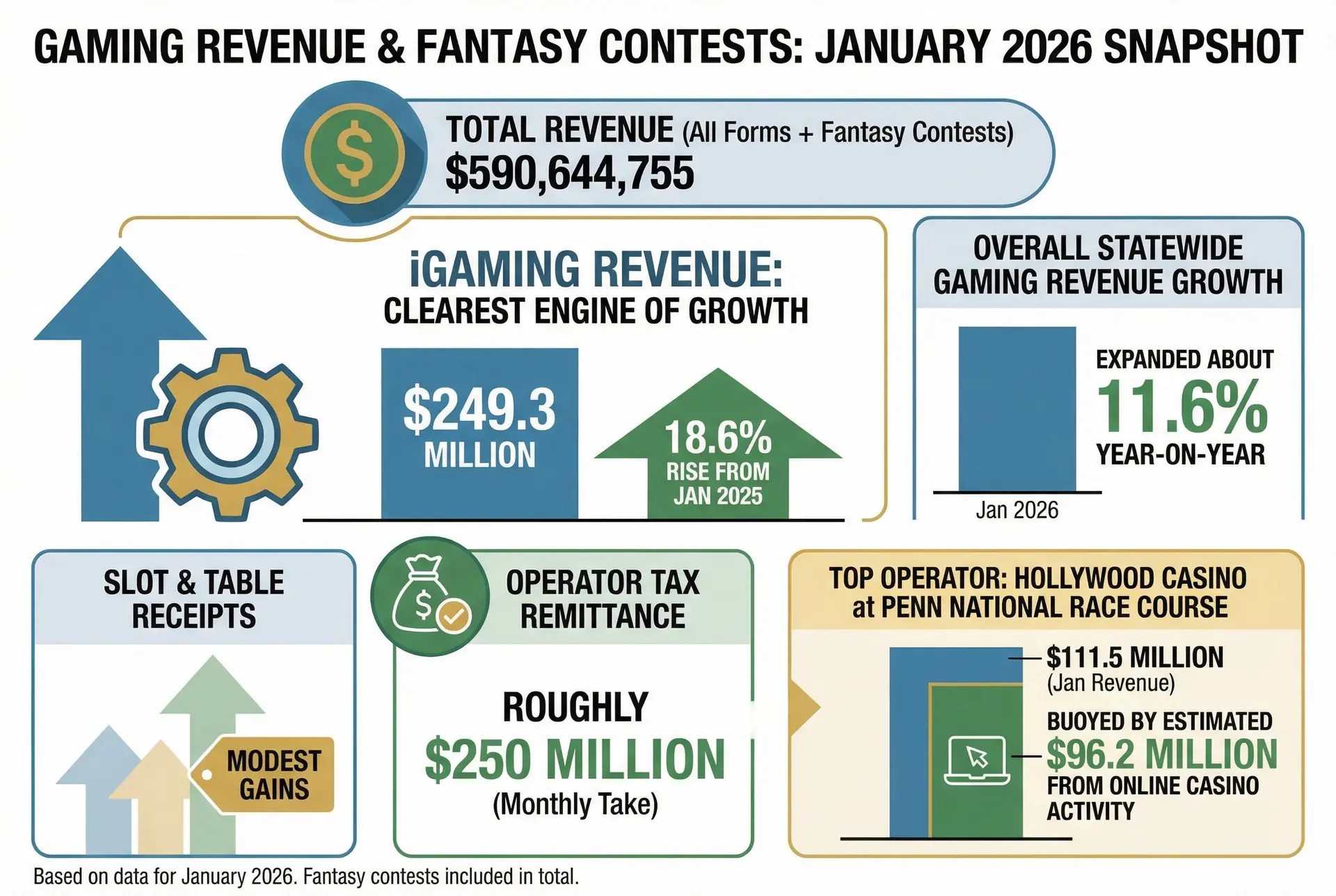 According to the Pennsylvania Gaming Control Board, online casino were the clearest engine of growth, climbing to $249.3 million, an 18.6% rise from January 2025. Overall statewide gaming revenue expanded about 11.6% year-on-year.