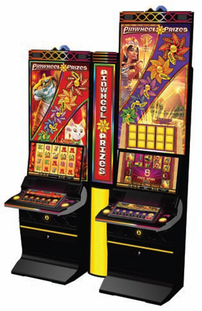 The Pinwheel Prizes series features two inaugural games, Pinwheel Prizes Cat & Tiger and Pinwheel Prizes Majestic Oasis. Both are 40-line games with five pinwheels on the top monitor displaying credit prizes. Scatters increase the value of the pinwheel wedges, which remain until three scatter symbols trigger a spin.