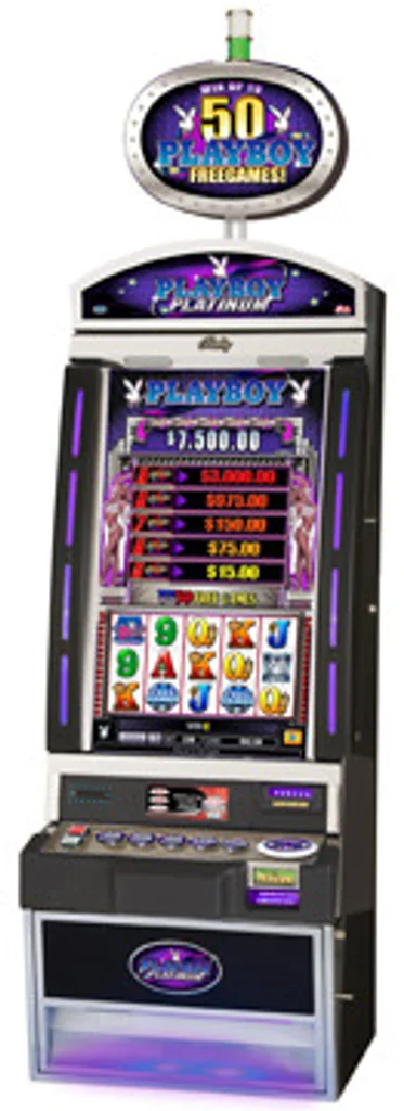 The free-spin bonus event has a unique twist. When three “Free Spin” symbols land on or within one space of the center, horizontal payline, the reels disappear and a grid of 20 tiles appears on the main game screen. The tiles cover up images of six scantily clad Playmates. The player selects symbols until one of the Playmates is completely revealed. Each Playmate corresponds to a number of free spins and a multiplier, ranging from five free games at 5X to 25 free games at 3X. When the Playmate is revealed, the progressives disappear and a full-frame image of the Playmate appears on the big vertical screen during the free-spin round.