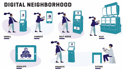 The concept of Everi’s “Digital Neighborhood” is centered around its core platform products and suite of services, Simmons says. These products and services interact with each other, whether it’s on the loyalty kiosk, in payments processing, at the ATM or in the back of the house through jackpot processing or compliance solutions.