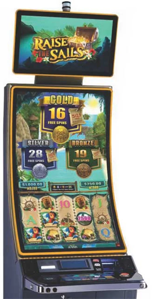The base game for the pirate/treasure-themed Raise the Sails is a five-reel, 243-ways-to-win slot featuring three separate free game features. The base game features cash-on-reels symbols. When a “Collect” treasure chest symbol lands on reel five, all credit values on all reels are instantly awarded.