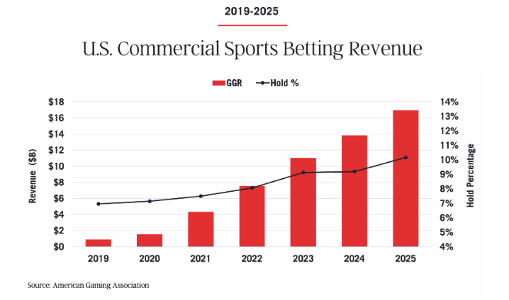 Sports betting continued to mature in 2025, delivering nearly $17 billion in revenue, a 23 percent increase year-over-year. Importantly, this growth reflects deeper engagement in existing markets, signaling organic expansion driven by increased consumer engagement and higher margin products.