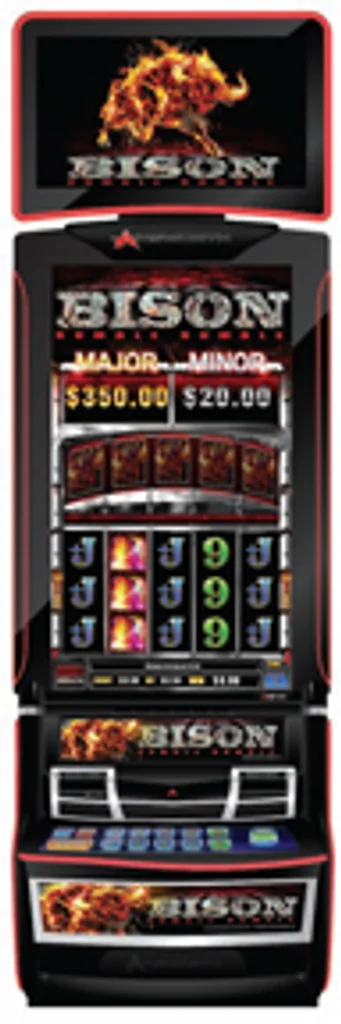 Three or more scattered Coin symbols trigger eight free games. During the Free Games Feature, when “Spin” appears anywhere on the fifth reel, the “Double Curved Reels Feature” is triggered with a bonus spin of the lower curved reel. Each of the five symbol positions on the lower curved reel corresponds to each of the five reels of the main game positioned directly below each. If “Wild Bison” appears on the lower curved reel, all symbols on the corresponding main game reels are transformed to “Wild Bison.” If one or more “Spin” appears anywhere on the lower curved reel, the upper curved reels are triggered with an Extra Bonus Spin.