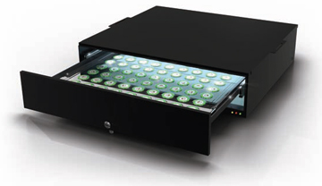 Its flexible design allows for one unit to be fixed under a gaming table playing surface or multiple units to be stacked in the gaming pit to sanitize hundreds of chips in minutes.