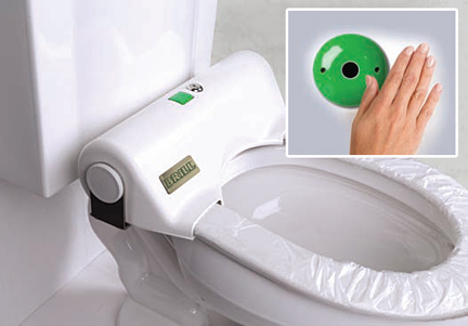 The Brill seat uses a feeder system to place new, sanitary plastic covers over toilet seats without the customer having to touch anything. The customer simply uses a hand-activation device on the wall to feed a new, sanitary covering to a toilet seat.