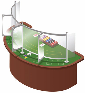 The VisiDeal Shield is a heat-formed, curved Plexiglas shield, produced in the form of dividers that can accommodate from two to six players on a table game. It is easy to install, and fits all standard blackjack and novelty table games. Custom manufacturing is available to accommodate craps, roulette and poker tables as well.