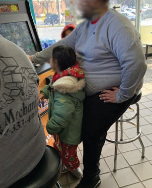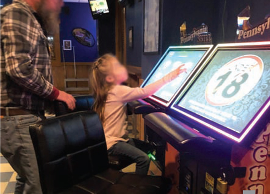 The organization has sent members out to take pictures at the locations, and has published a rogues gallery of photos that show the games—which pay out in cash or tickets that can be redeemed for cash—are easily accessible to children. One photo shows a man playing a slot-like device with his daughter, a toddler, in his lap wearing pajamas.