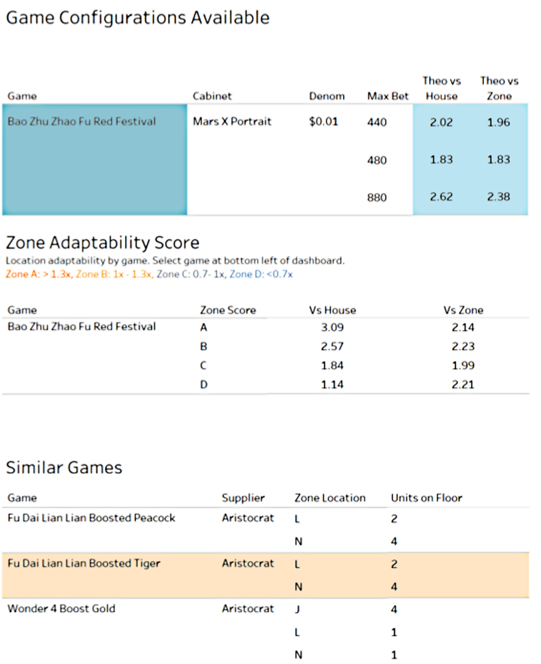 With seemingly infinite combinations of themes, configurations, and location placement options, we’ve developed to tools support decision-making. Operators with premium subscriptions can access these functions. See Figure 1 from our Game Configuration Dashboard to see our recommendation for Aristocrat’s Bao Zhu Zhao Fu Red Festival.