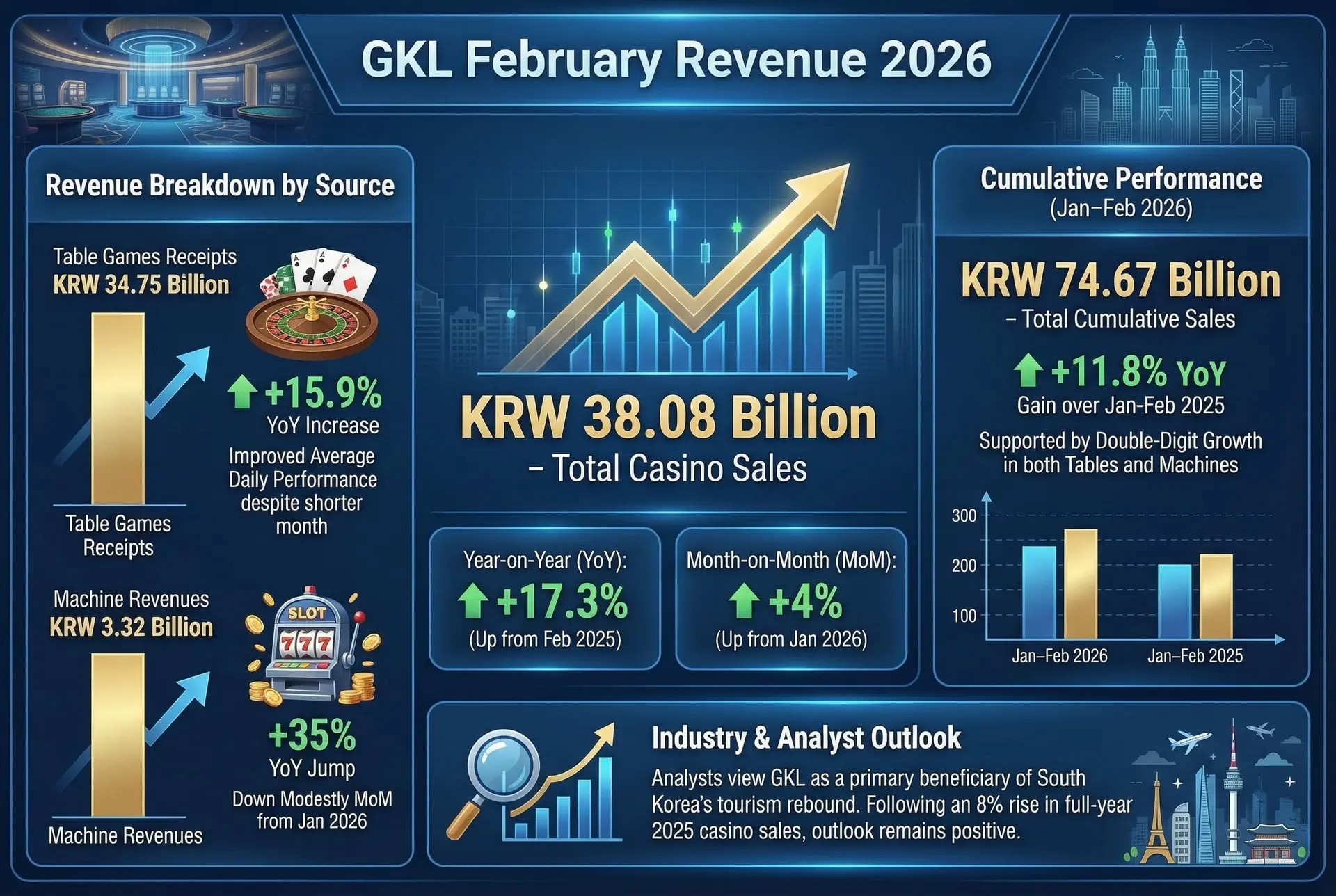 Cumulative sales for January-February totaled KRW74.67 billion, an 11.8% gain over the same period in 2025, supported by double-digit growth in both tables and machines. GKL was a primary beneficiary of South Korea’s tourism rebound, following an 8% rise in full-year 2025 casino sales.