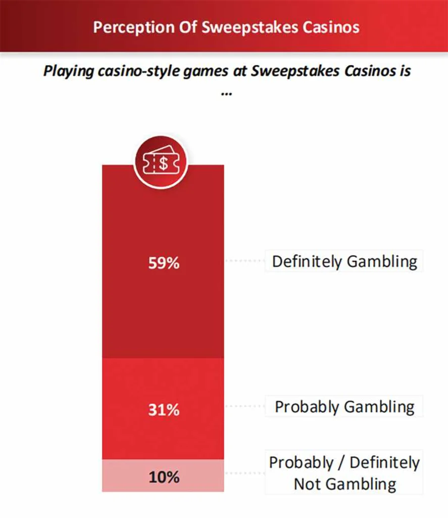 According to the AGA study, more than half (59 percent) of sweeps players surveyed said that playing casino-style games on sweeps sites is “definitely gambling,” compared to just 10 percent who said that it was “probably/definitely not gambling.” The remaining 31 percent indicated that sweeps sites “probably” constitute real-money gambling.