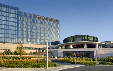 Even without table games and with a limited selection of slot games, Genting’s Resorts World New York City at Aqueduct racetrack is one of the most successful casinos in the world, and is a favorite to win one of the three New York City area licenses. (Photo by Andrew Rugge, courtesy Perkins Eastman)