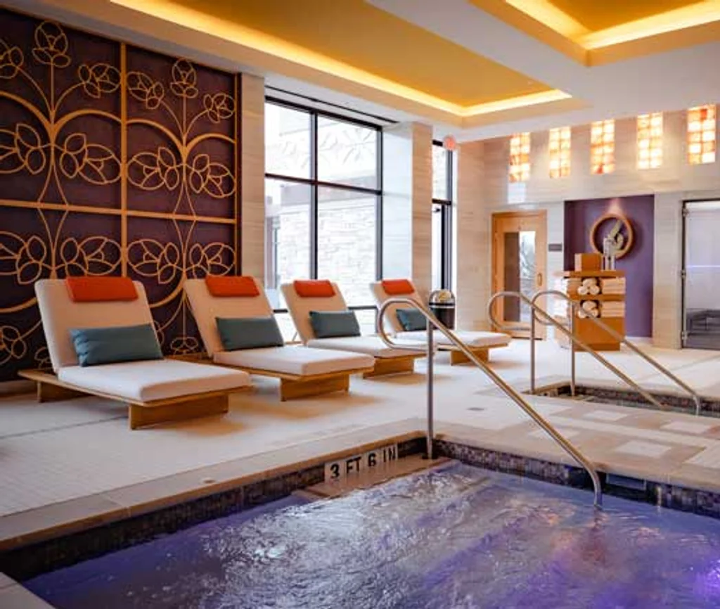 The spa features a palette of calming colors, accentuated by the soothing glow of 48 Himalayan salt tiles embedded in a wall of soft white and gray to infuse the space in calming energy. As guests step into one of two plunge pools, they will undoubtedly reflect on the intricately carved wood relief on the opposing wall. Moving deeper into the spa area, guests will find an abundance of space to relax in the new 179-square-foot steam room.