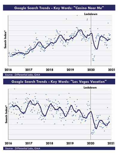Differential Labs, the leading AI company for the gaming and hospitality industry, provided an index of Google search volumes on select topics over the last five years. Leading up to the pandemic, American consumers’ interest (from a search perspective) in a trip to Las Vegas appeared to be declining since 2017, while interest in local casino options continued to rise. This further illustrates that searches for “Casino Near Me” decreased sharply after lockdowns were announced, followed by a sharp increase, nearly returning to pre-pandemic levels. People are looking for casino trips, but not necessarily to Las Vegas.
