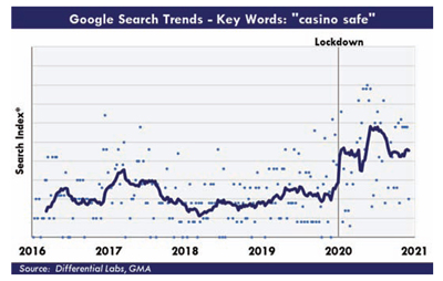 Not surprisingly, interest in casino safety remains well above pre-pandemic levels, including above the peak in 2017 in the wake of the deadly mass shooting that occurred in Las Vegas. The key difference now is that in the eyes of the customer, there are several more factors to consider in casino safety beyond in-house security. This is amplified for Las Vegas and other destination markets that will rely on health and safety measures in long-distance transportation and other supporting sectors. Players want to return to the floor, but they want to return to a safe, healthy and comfortable casino environment.