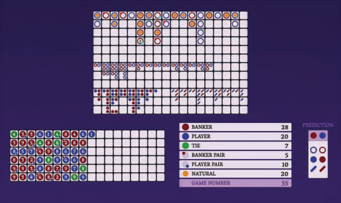 Management quickly saw the advantage of providing the customers with a more efficient result-tracking system, and installed electronic scoreboards on each table. Scoreboards in baccarat track the previous results, usually in two different scoreboard screen formats (Bread Pan and Big Road). The boards also post “prediction” screens such as “Little Road, Big Eyed Boy, and Cockroach Tail” which advise the customers if the patterns indicating the winning results will “streak” and repeat, or if the winning outcomes “chop” or bounce back and forth between Player and Banker.