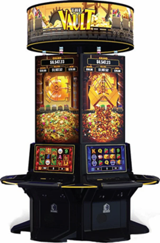 There are three base games—China Blessings, Egypt Gems and Vegas Luck. All are five-reel, 30-line or 40-line games, with the large top portrait monitor displaying an open vault with gold and jewels pouring down toward the reels.