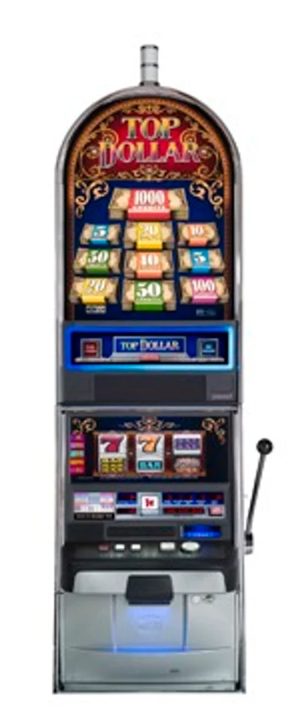 In the classic Top Dollar game, three bonus symbols on the payline trigger flashing lights behind the light-box display in the top box. The new S-AVP versions replace the light box with a huge LCD video display, surrounded by a color-sequencing LED light ring that choreographs the display. Also, IGT has added an integrated small LCD screen for promotional messages.