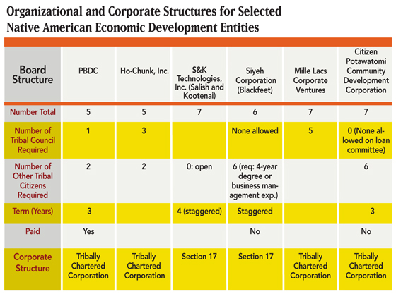 Board member requirements are varied. In some cases, all board members must be tribal council members, while in others tribal council members and officials are not permitted to serve on the board. Frequently, tribes require a mixture of council persons, other tribal members and outside business or economic development professionals.